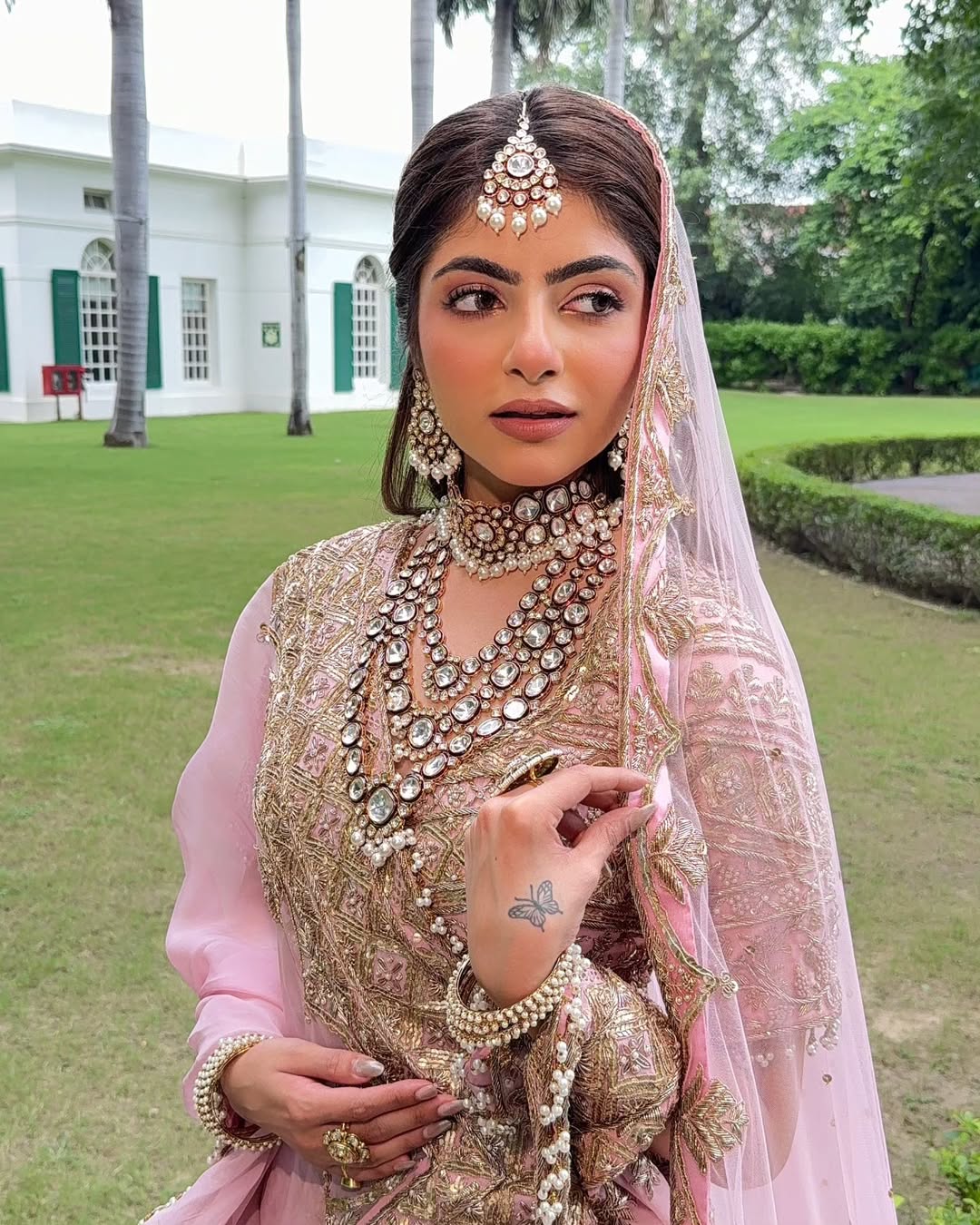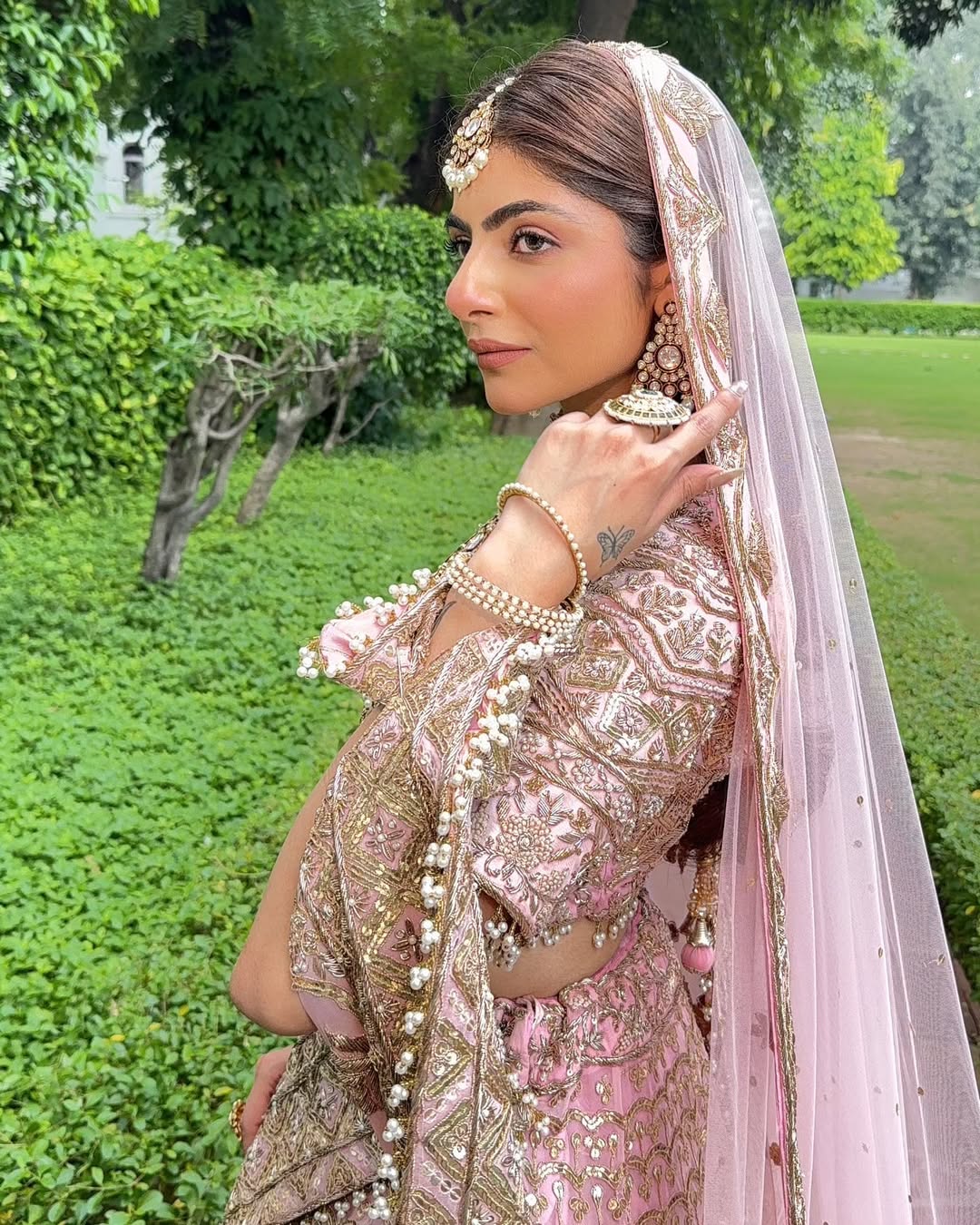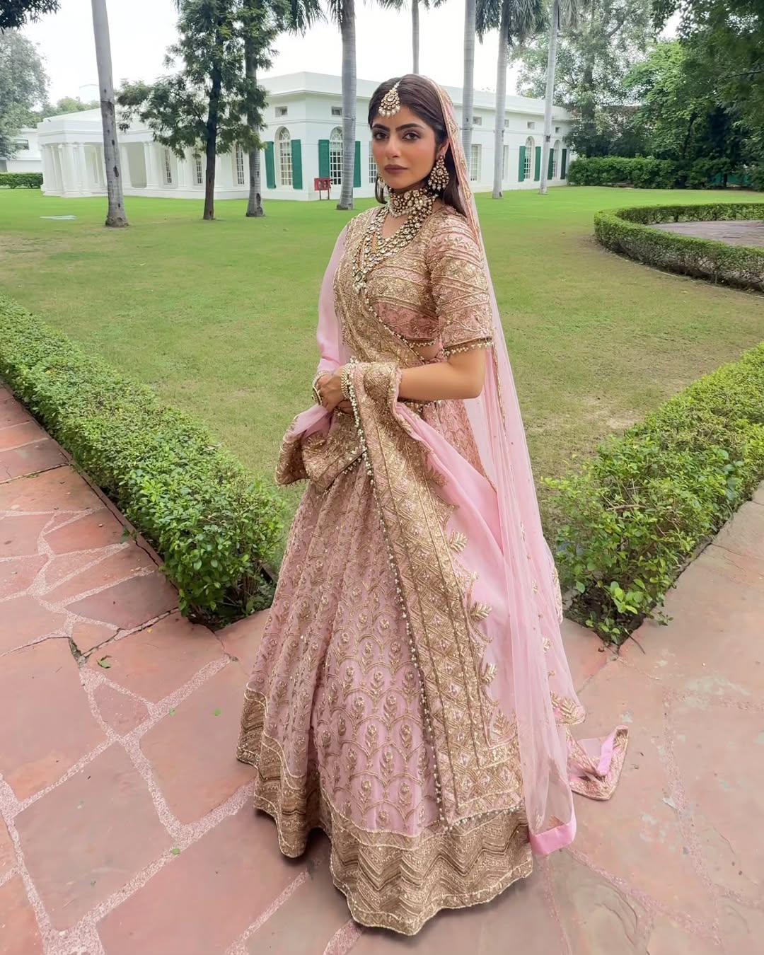 An exquisite blush pink lehenga set enriched with intricate gold embroidery, creating a timeless bridal aesthetic. Paired with a heavily detailed blouse and a soft sheer dupatta, the ensemble exudes elegance and grandeur, ideal for weddings and ceremonial celebrations.