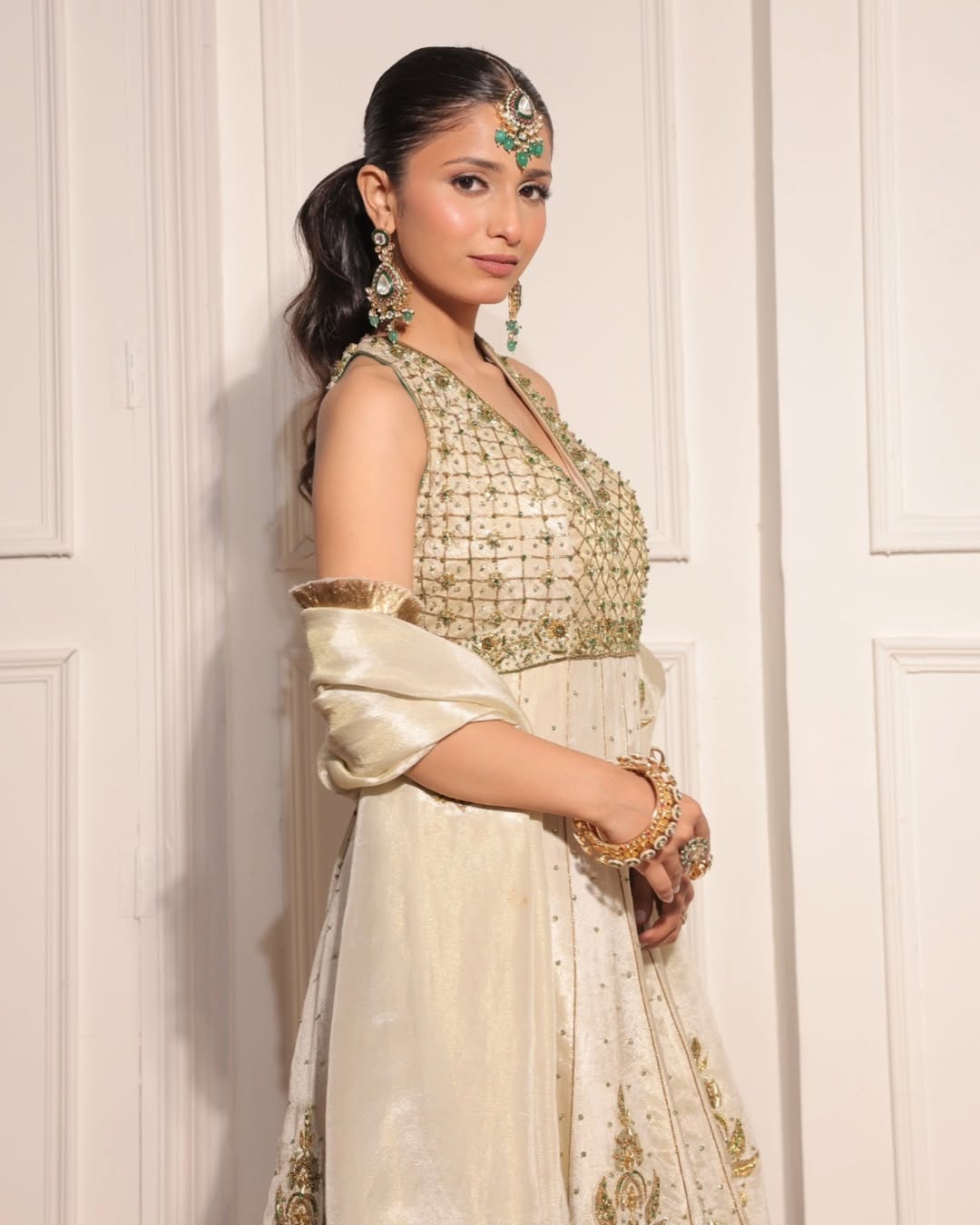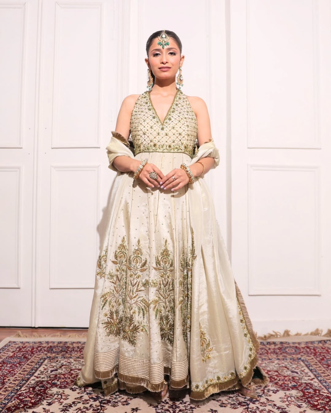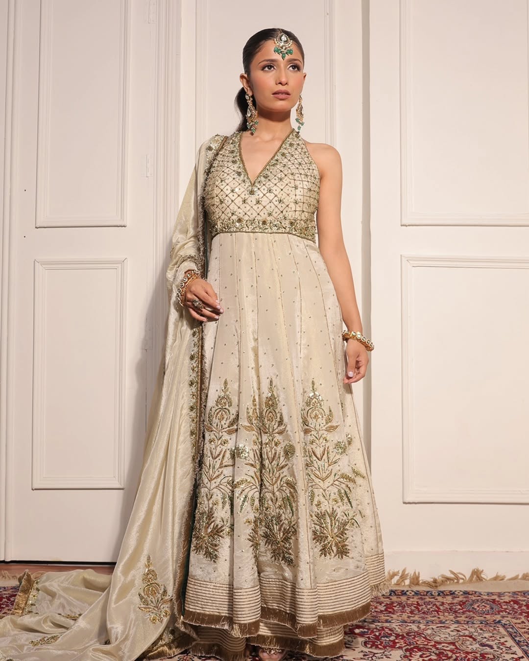 A refined ivory ensemble featuring a halter-style anarkali adorned with intricate gold embroidery and delicate motifs. The structured bodice flows into a gracefully flared silhouette, complemented by a richly detailed dupatta that enhances its timeless elegance.