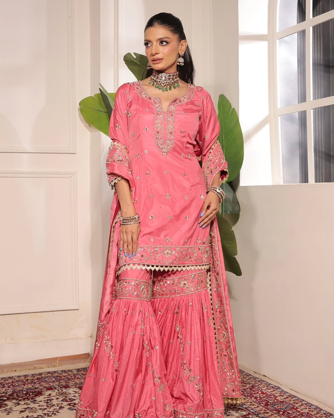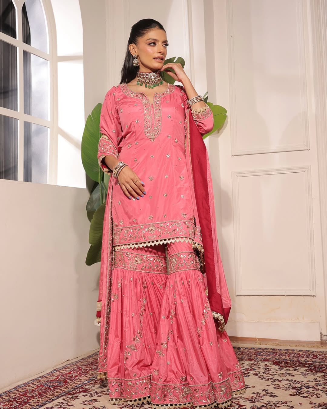 A vibrant pink ensemble featuring delicate gold embroidery, highlighted by a finely detailed kurta with intricate neckline and scattered motifs. Paired with a voluminous sharara adorned with ornate borders and complemented by a coordinated dupatta, this look exudes festive charm and graceful movement.