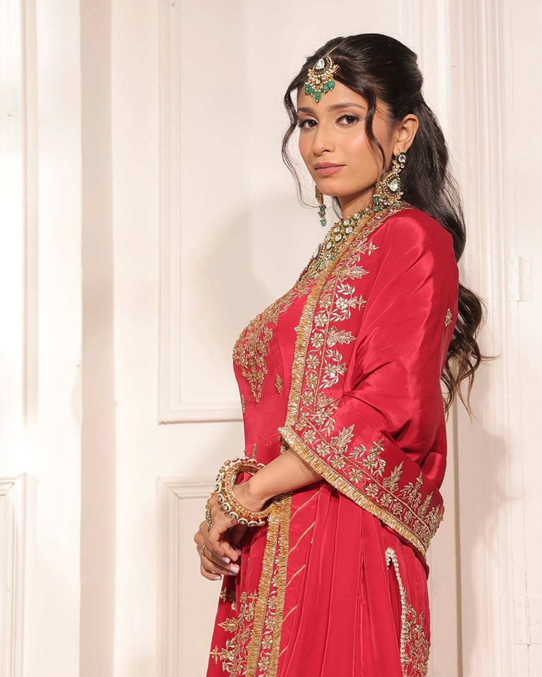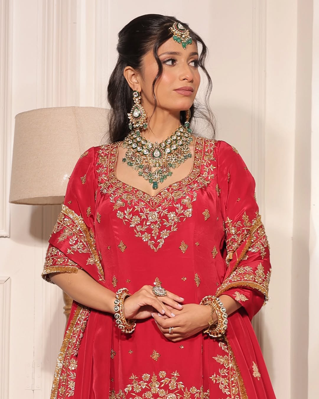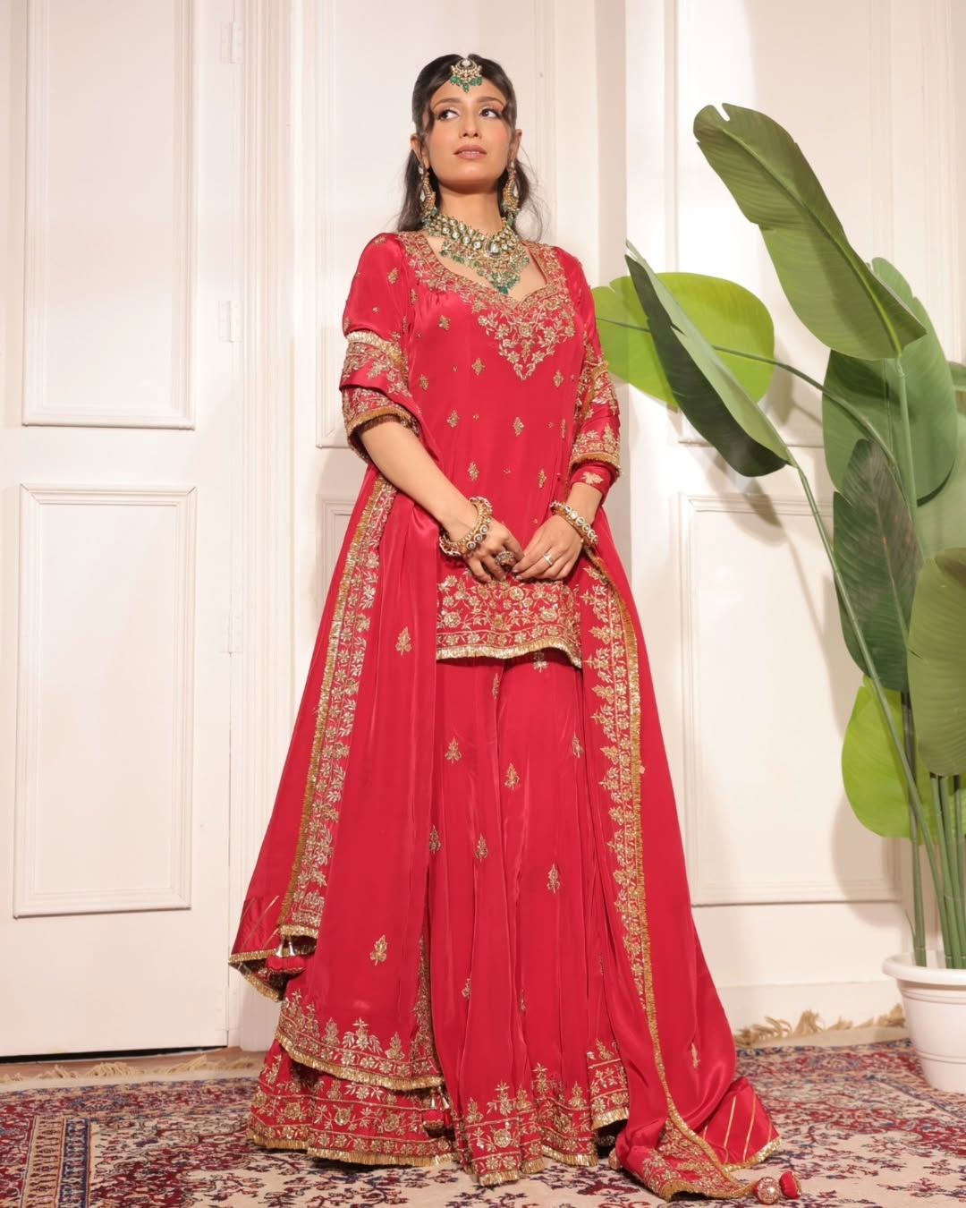 A graceful red ensemble featuring intricate gold embroidery, highlighted by a finely detailed kurta with delicate motifs and a flattering neckline. Paired with a flowing sharara enhanced with subtle embellishments and finished with a coordinated dupatta, this look blends tradition with effortless elegance.