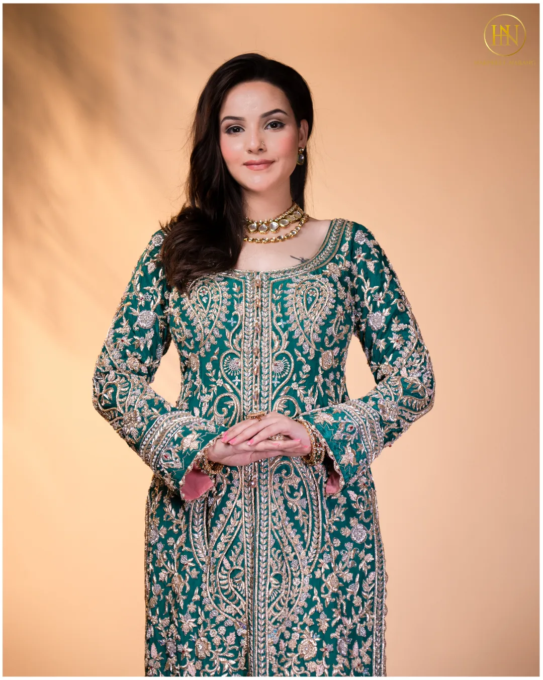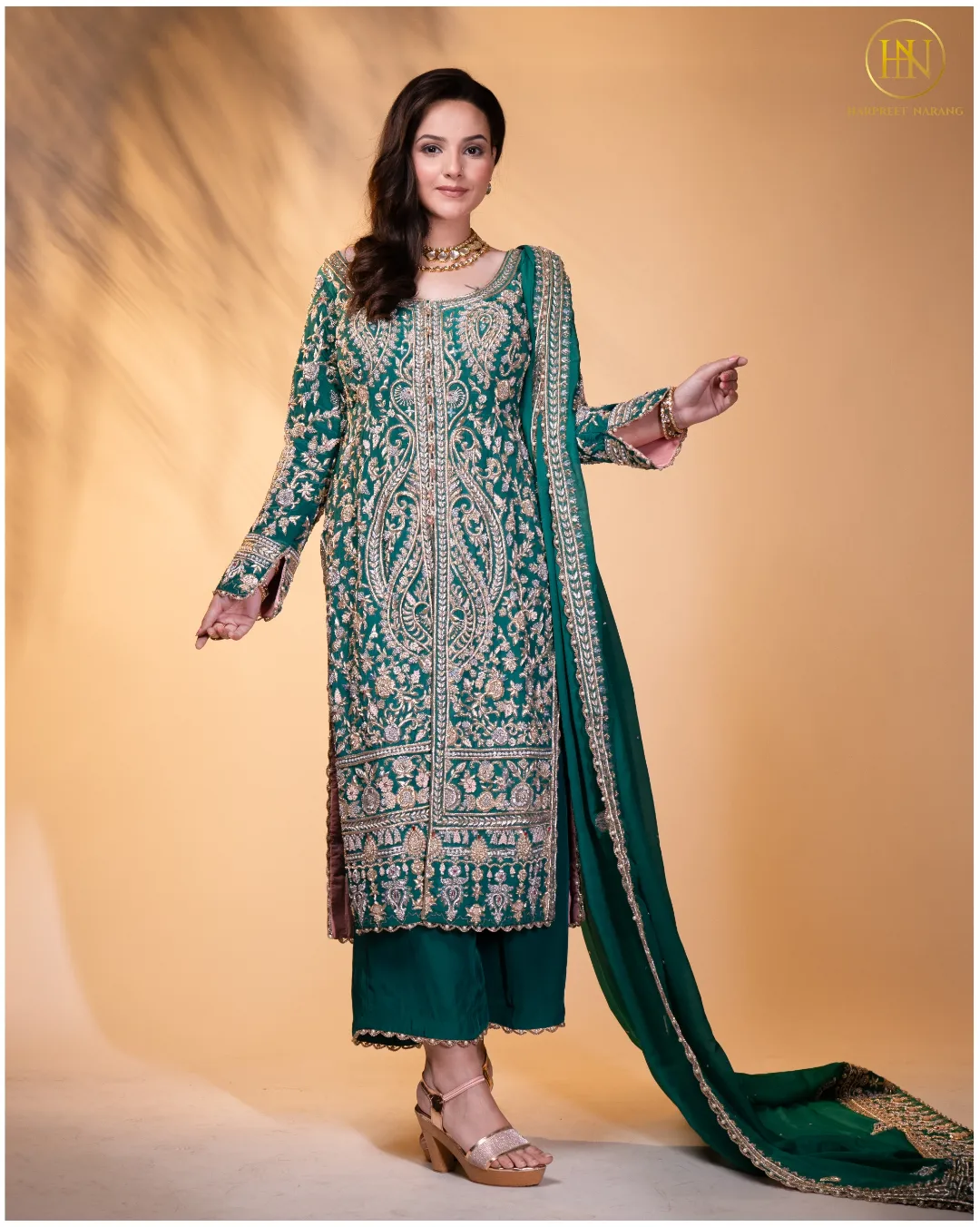 An elegant kurta set adorned with intricate embroidery and delicate embellishments that reflect refined craftsmanship. Paired with coordinated bottoms and a graceful dupatta, this ensemble blends traditional artistry with timeless festive sophistication.