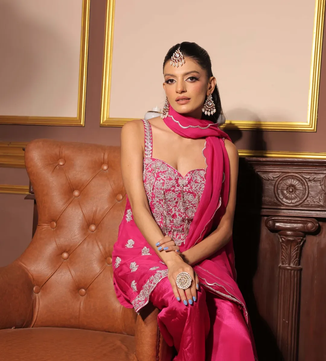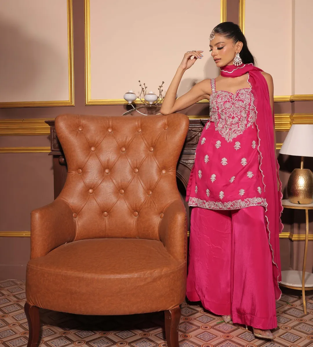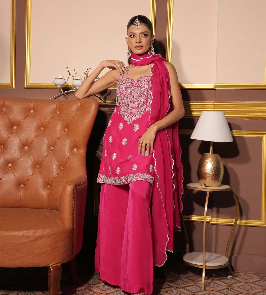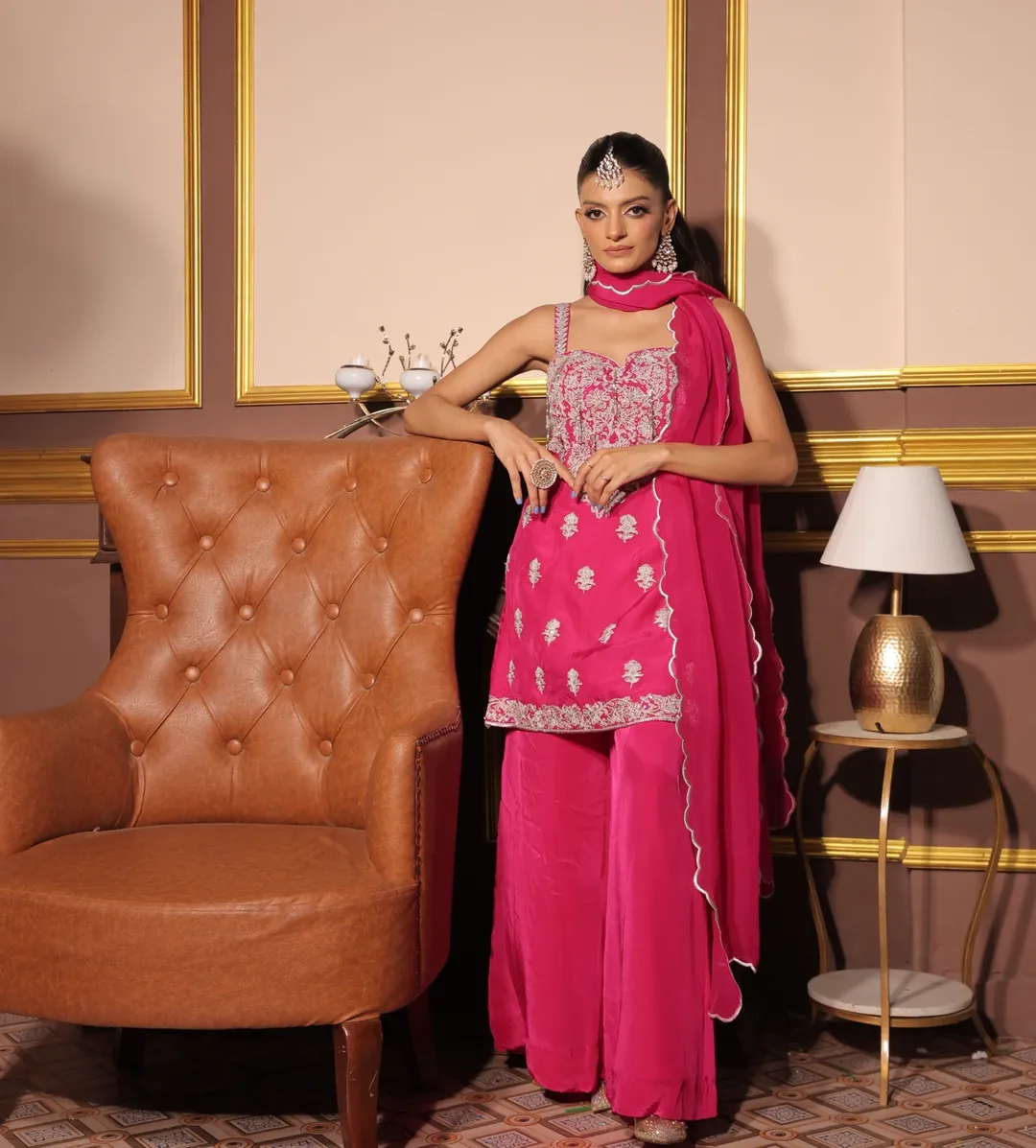 A vibrant fuchsia pink ensemble featuring a delicately embroidered sleeveless kurta with intricate detailing across the bodice and hem. Paired with flowing sharara pants and complemented by a soft matching dupatta, this outfit radiates festive elegance with a contemporary silhouette.