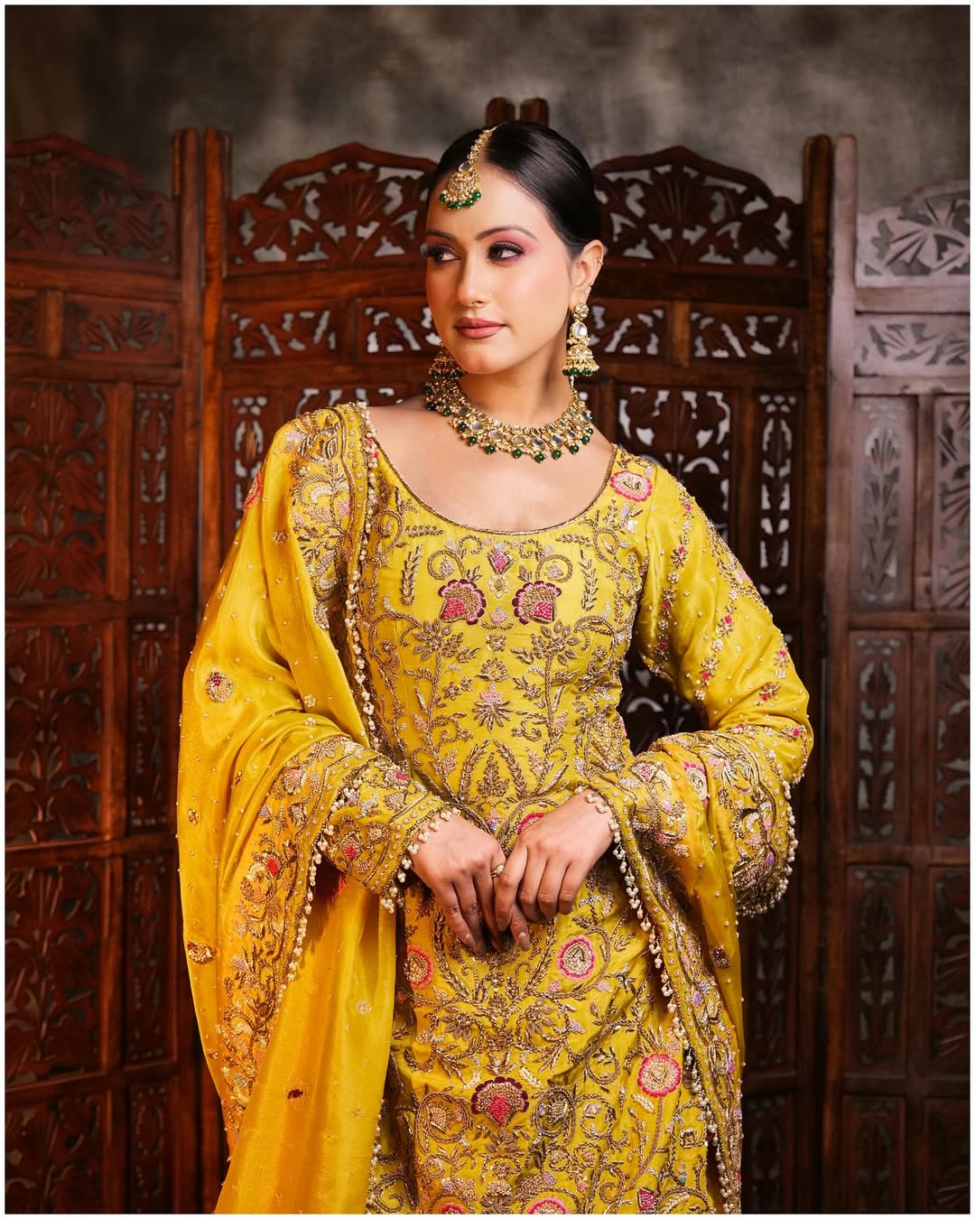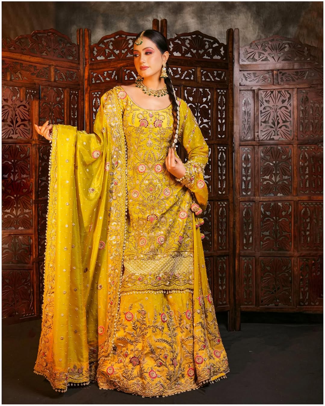 A richly detailed lehenga set adorned with intricate embroidery and vibrant motifs that reflect fine craftsmanship. Paired with a matching blouse and a gracefully draped dupatta, this ensemble captures timeless elegance with a bold festive charm.