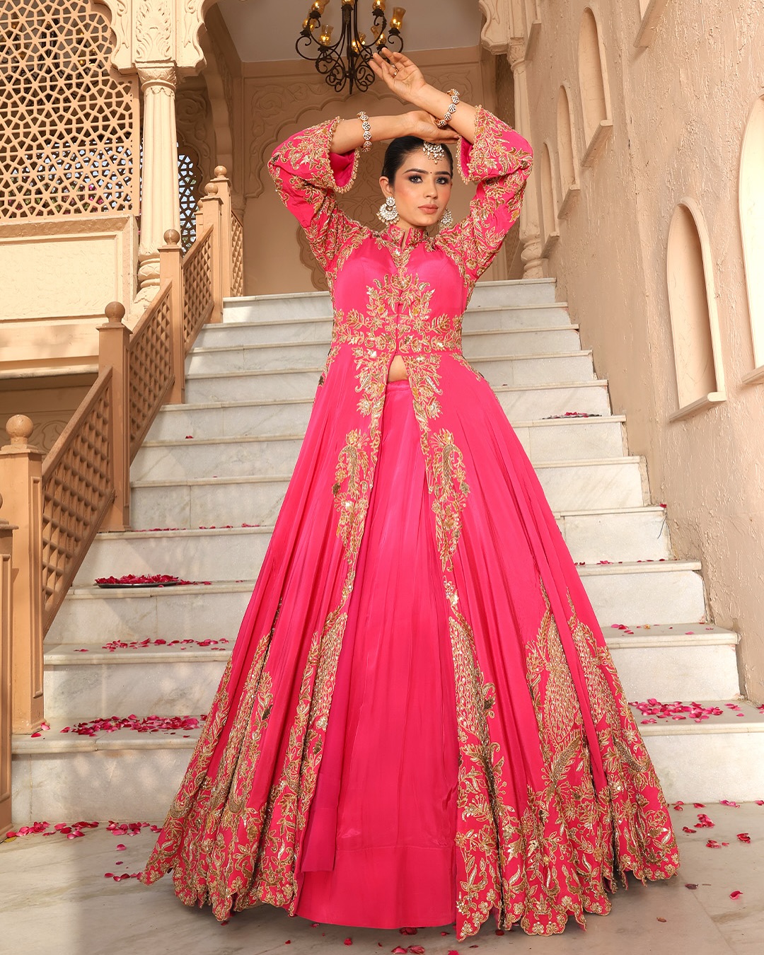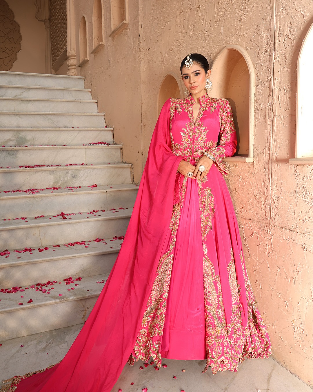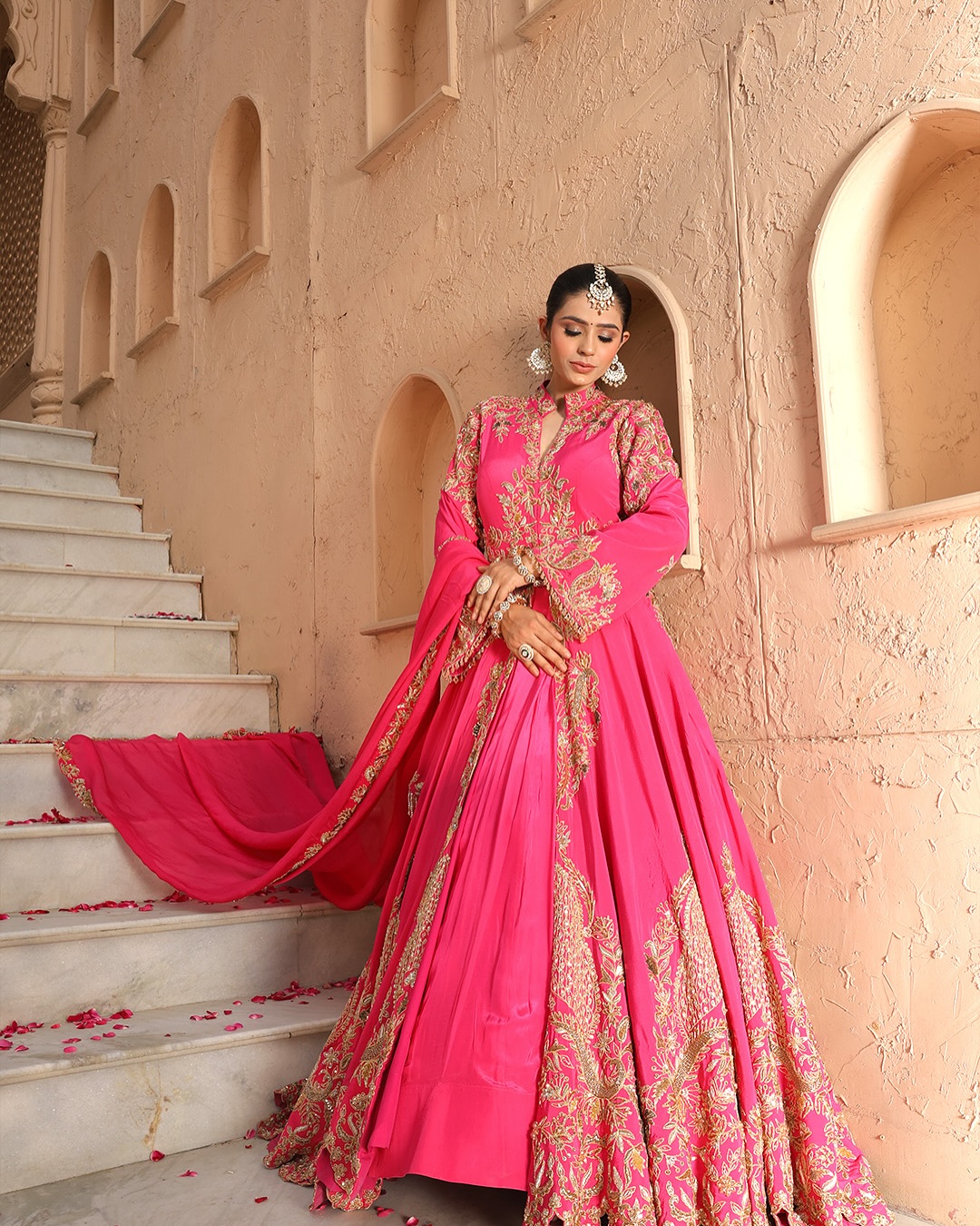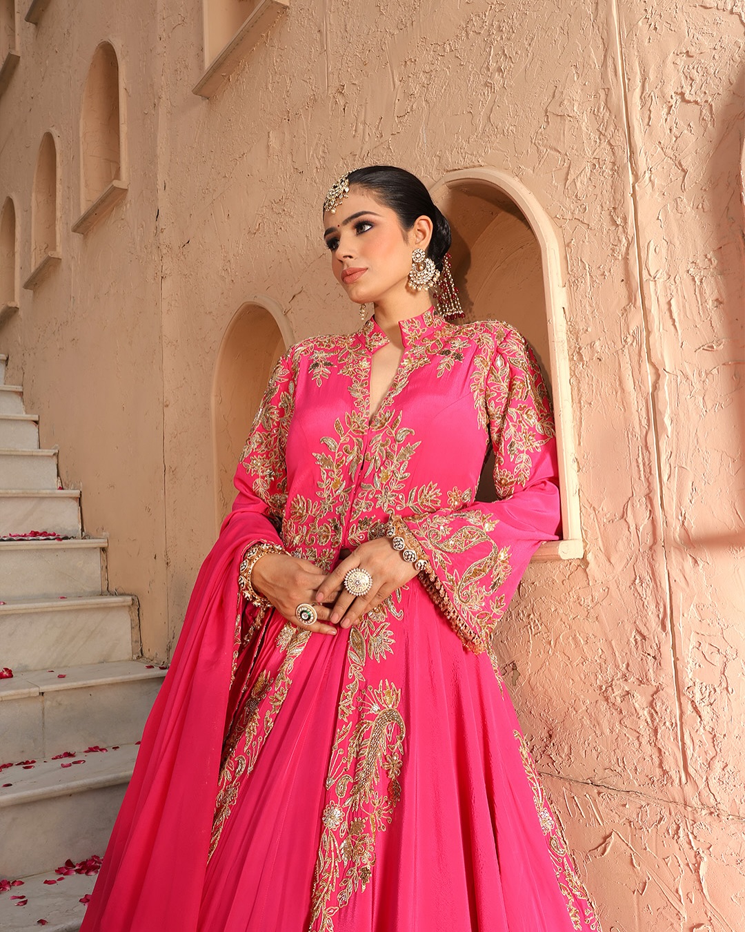 A striking anarkali ensemble crafted in a vibrant rose pink hue, adorned with ornate gold-toned embellishments that trace graceful motifs across the bodice, sleeves, and hemline. Designed with a flowing silhouette and architectural detailing, this piece blends festive grandeur with contemporary elegance, making it ideal for wedding celebrations and ceremonial occasions.