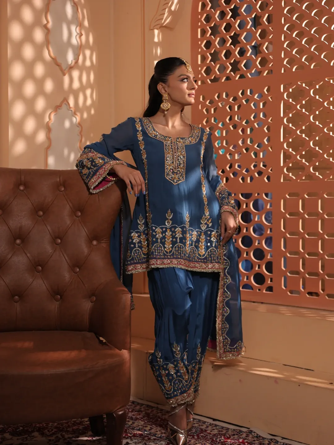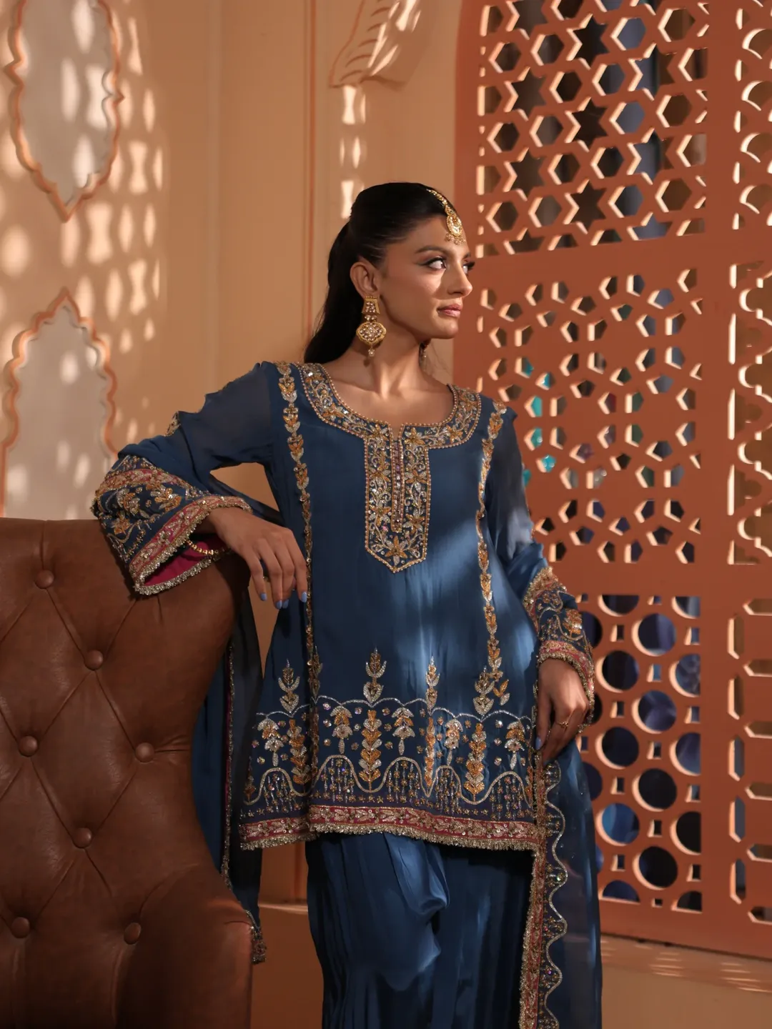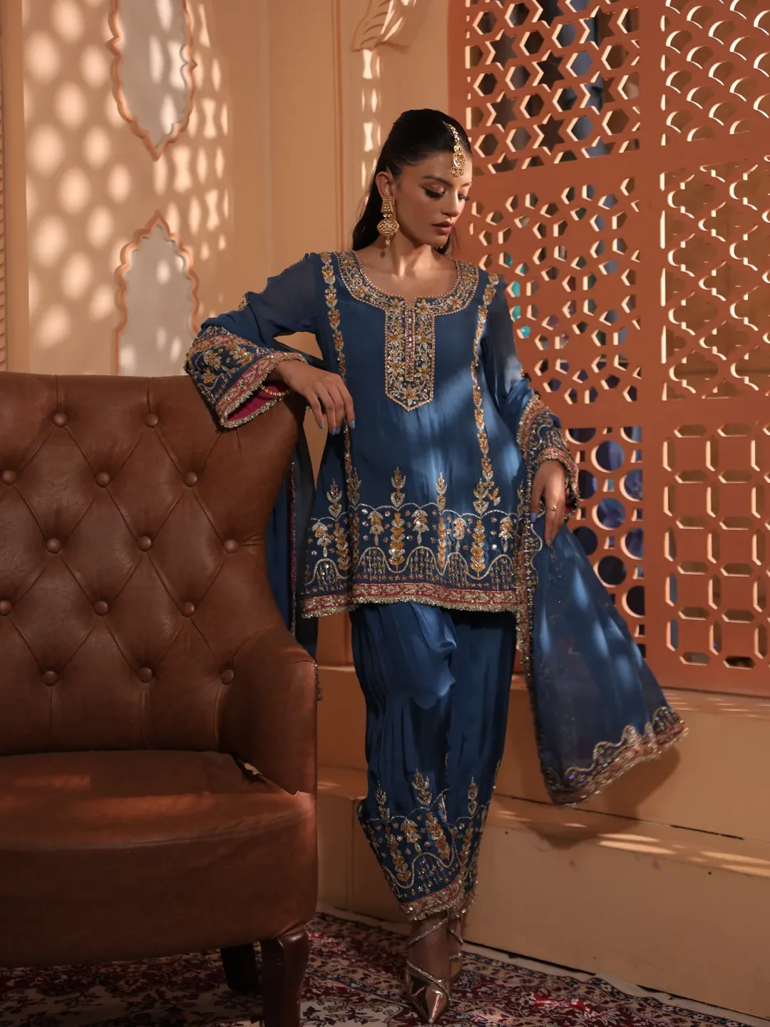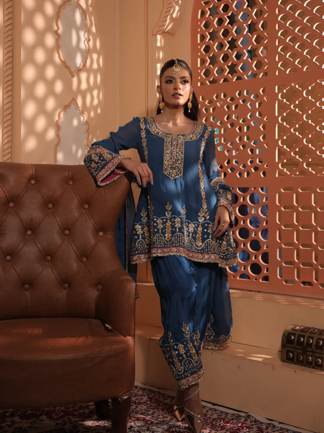 A regal royal blue kurta set adorned with intricate gold embroidery that highlights the neckline, sleeves, and hem with exquisite craftsmanship. Paired with matching embroidered bottoms and a coordinated dupatta, this ensemble exudes timeless elegance and festive sophistication.