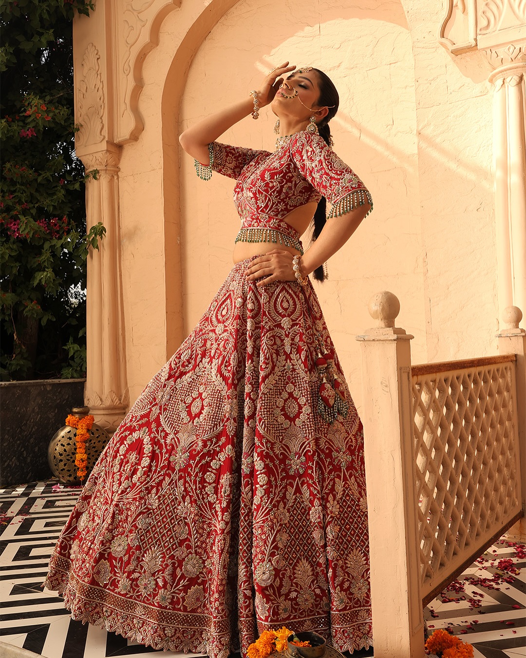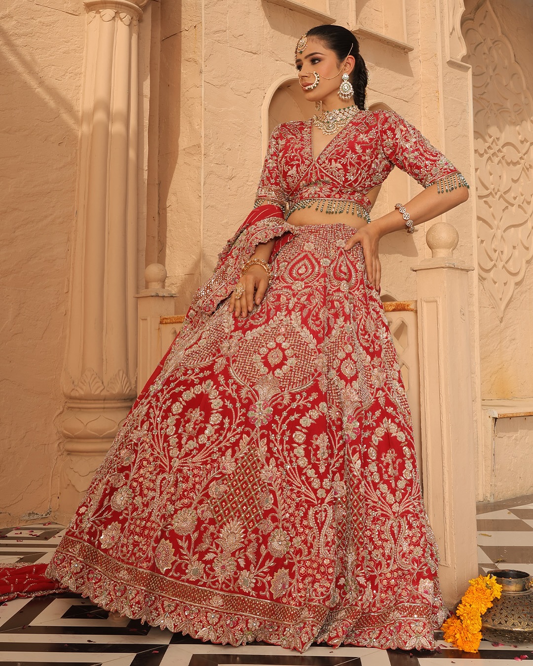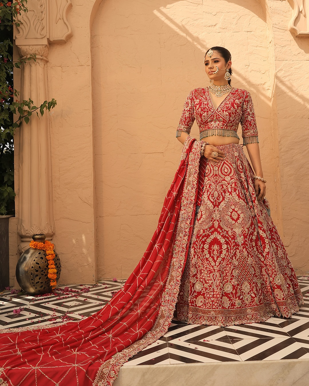 A regal bridal lehenga set crafted in a deep ruby red hue, adorned with ornate gold-toned motifs that create a rich, traditional narrative across the silhouette. Complemented by a structured blouse and an elongated dupatta featuring linear detailing and an embellished border, this ensemble evokes timeless bridal grandeur with a poised, contemporary finish.