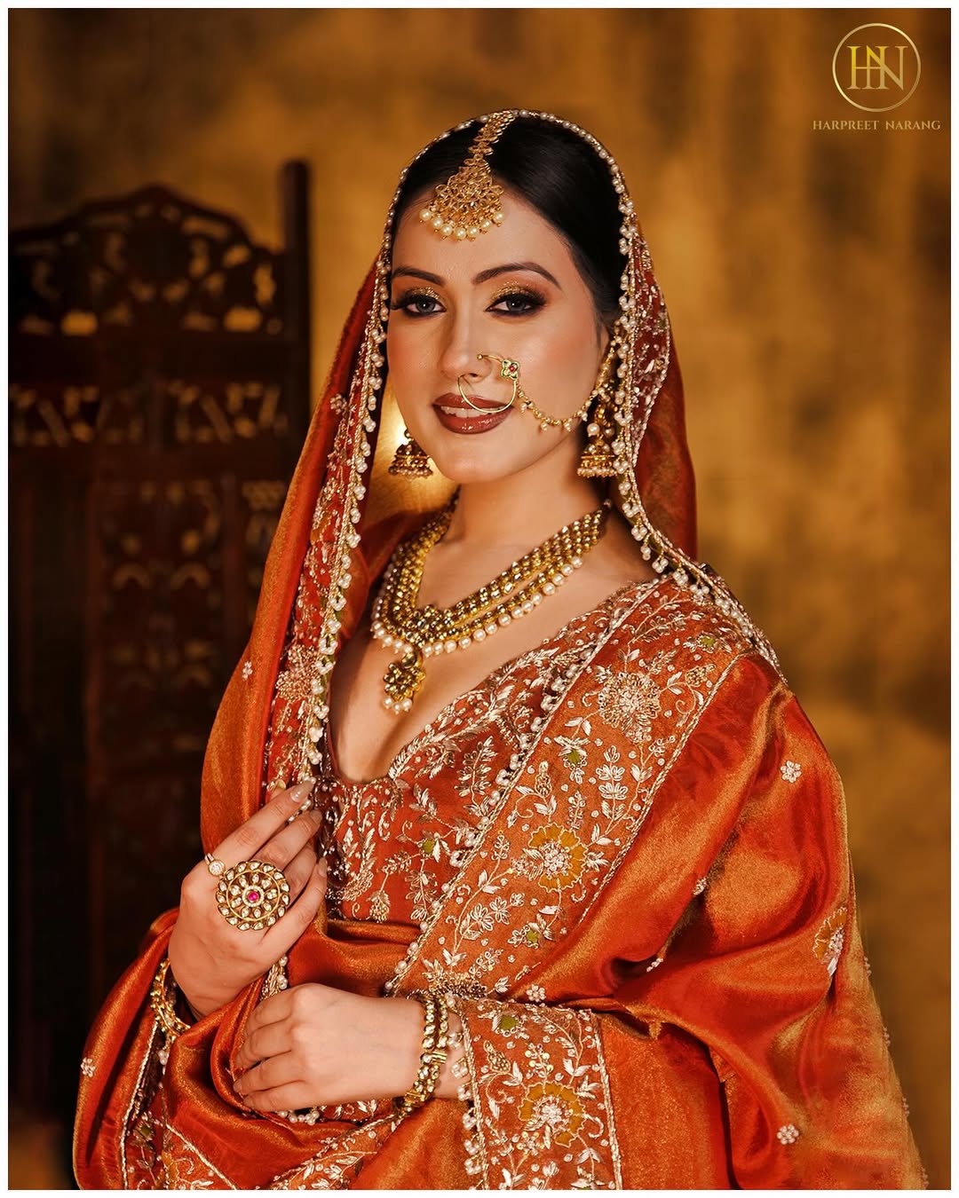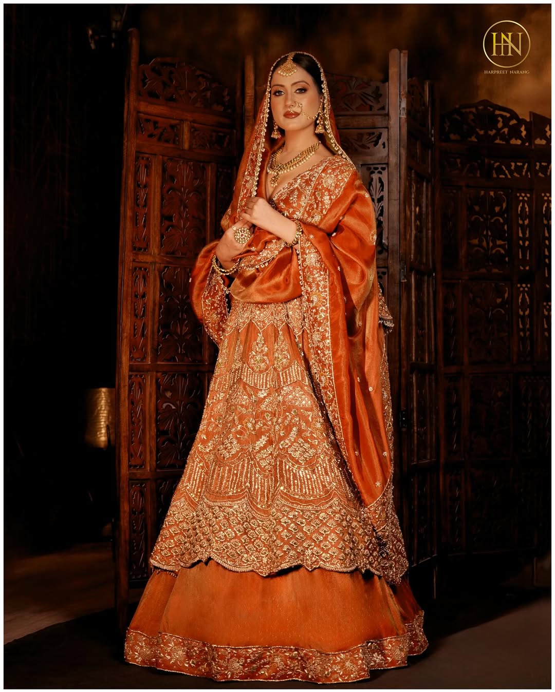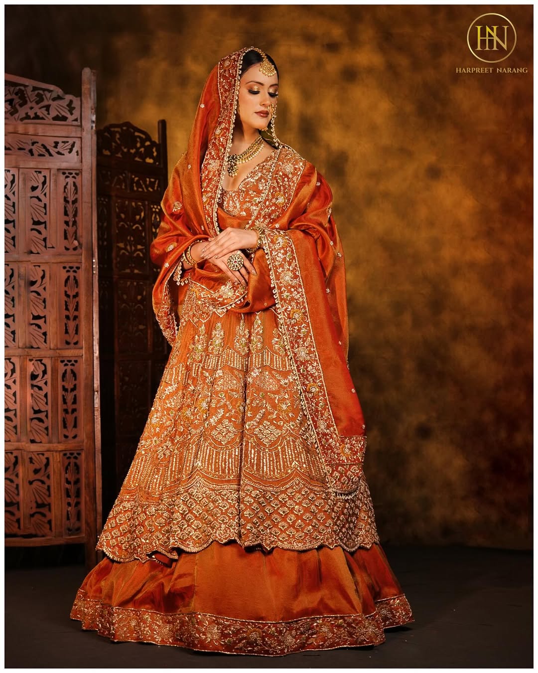 A regal rust lehenga set adorned with intricate zari and heritage embroidery, paired with a richly detailed dupatta, exuding timeless bridal elegance and grandeur.