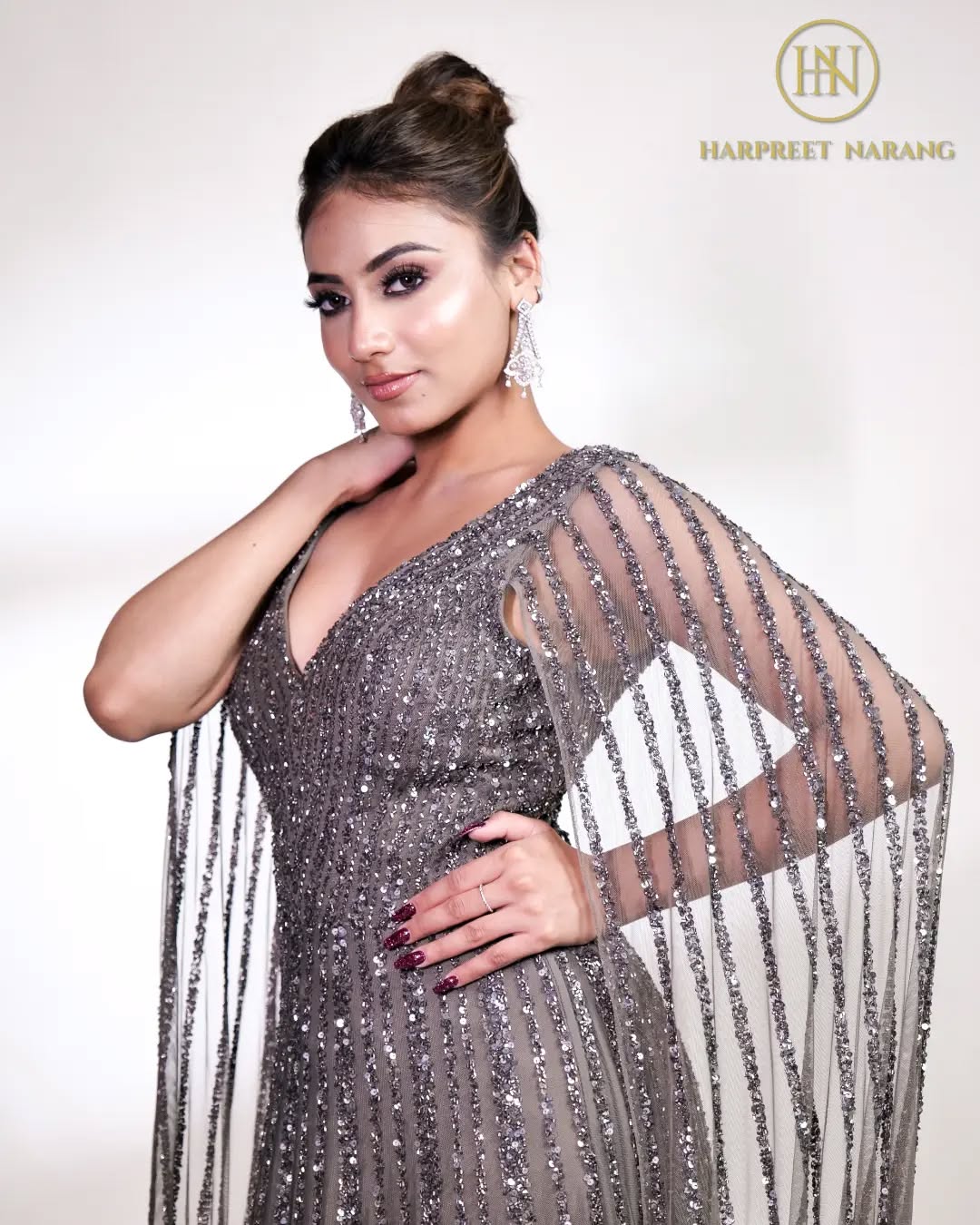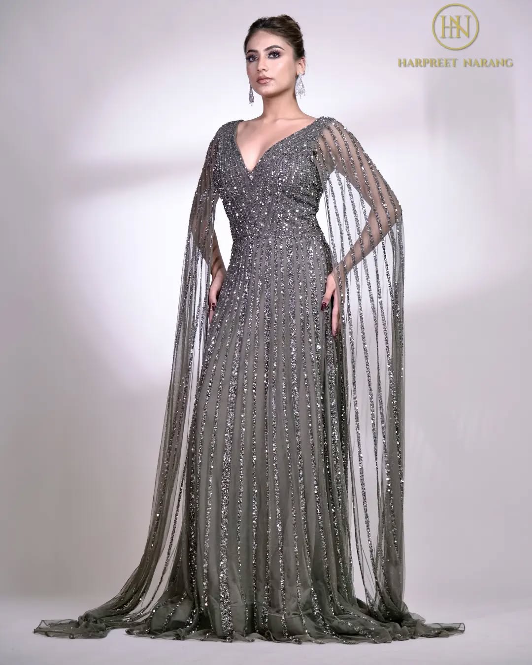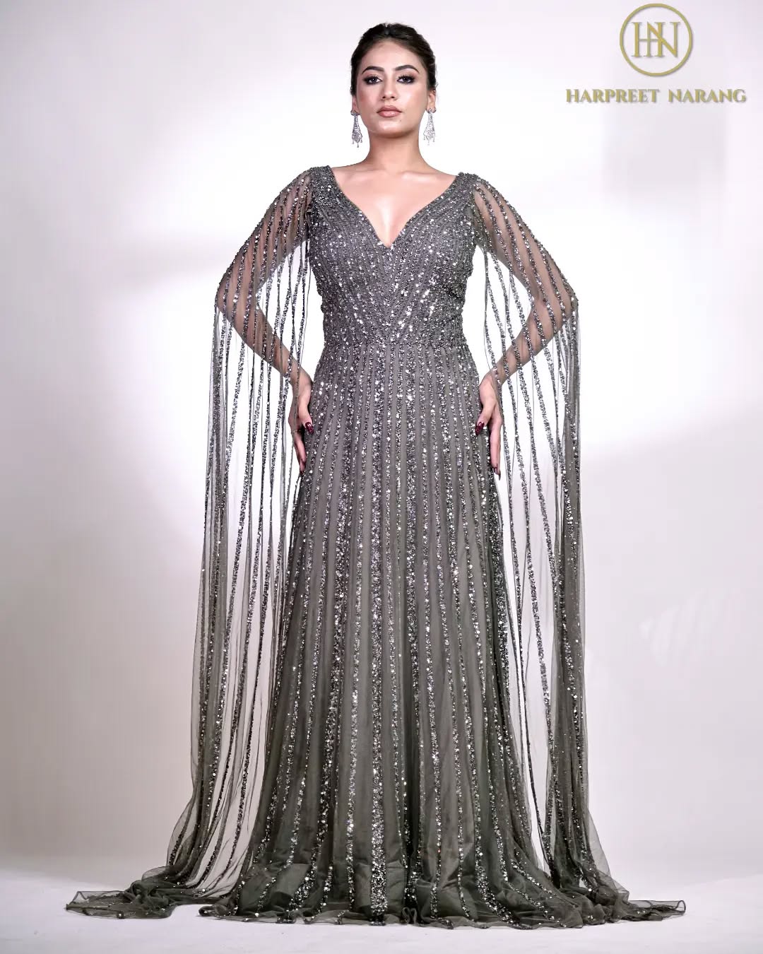 An elegant evening gown in a refined steel grey hue, intricately adorned with shimmering embellishments that create a graceful vertical pattern across the silhouette. Designed with dramatic cape-style sleeves and a flattering V-neckline, this gown exudes contemporary glamour and regal sophistication, perfect for formal evenings and grand celebrations.